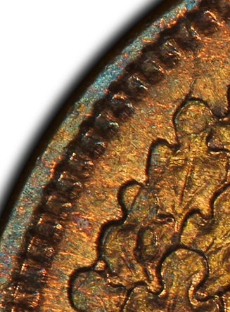 | Obverse and reverse are in die stage B. Reverse clashing visible from clashing with obverse 4 while reverse AA was in 8 degree counter clockwise rotation. *Plate coin courtesy of PCGS Coinfacts, PCGS MS64RB | ![]() |