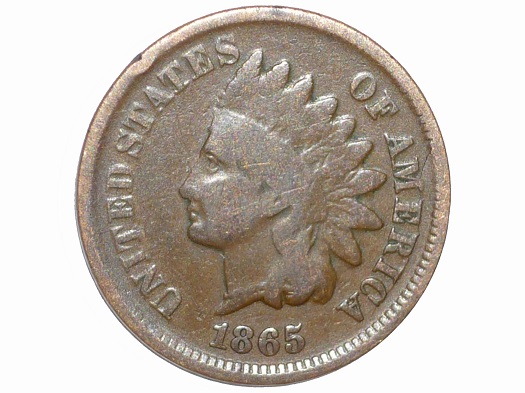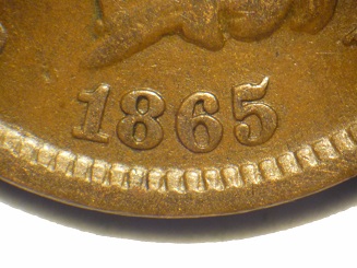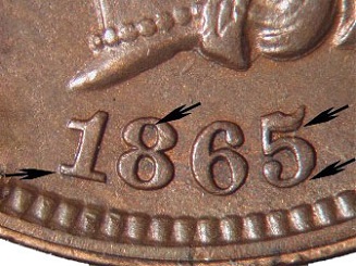 7 is identified by repunching to the south on the 1865, a possible misplaced digit between the ribbon and hair curl and date