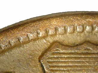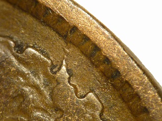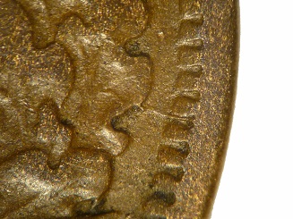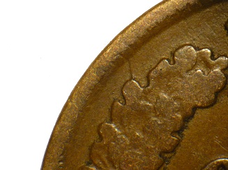 developed the following die cracks: 1. Die Crack from the rim at 1:30 continuing into the wreath, where a small die break occurs. 2. Radial die crack from the rim at 3:30 continuing into the wreath. 3. Die crack from the denticles at 5:00 extending up through the wreath stem and ribbon knot. 4. Die crack from the denticles at 10:30 extending into the wreath. 5. Die crack from the rim at 11:30 and extending into the top left of the shield.