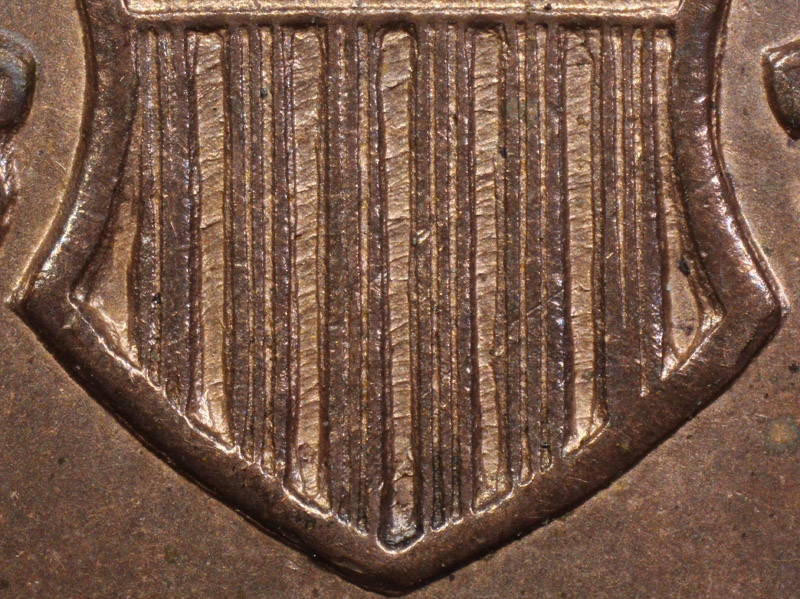 Reverse B is observed with die lines located within the vertical shield bars.