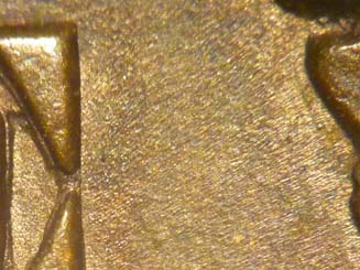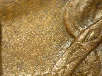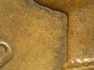 2. Light die crack in the right wreath from die crack #1 extending upward to a point in the wreath at 2:30.