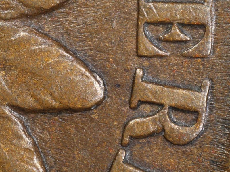 Moderately heavy die crack from the rim at 6:15 extends upward