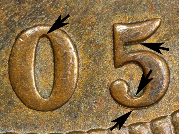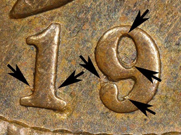 the ball of the 9, as well as the initial date impressions of the 0 and