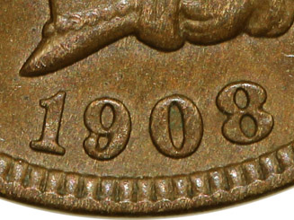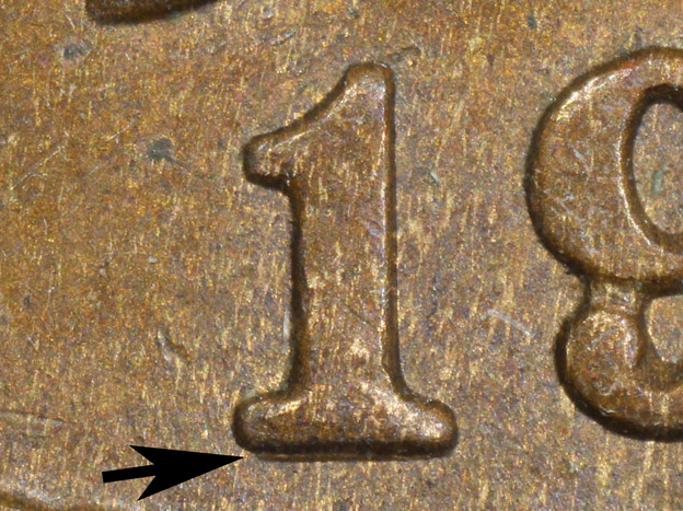 that features an initial date impression below the base of the 1.
