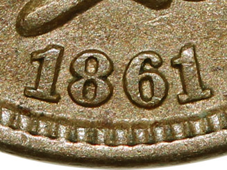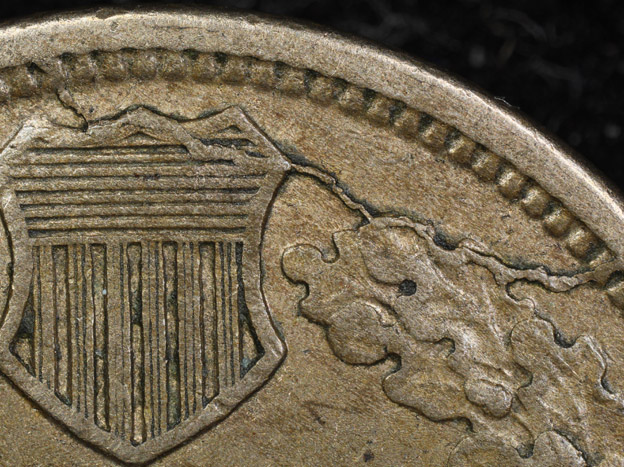 of the shield. 2. Die crack from the rim at 4:45 extends upward through the right ribbon end. 3. Die crack from the rim at 8:45 extends upward through the outer edge of the left wreath.