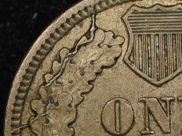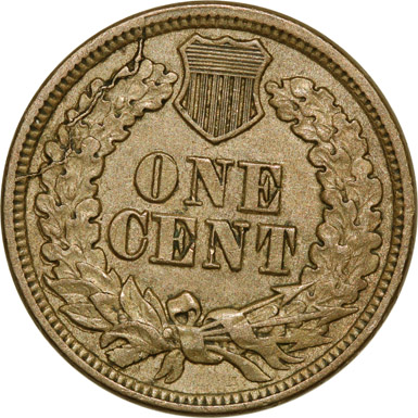 Reverse AAH is rotated 6 degrees clockwise and has developed the following die cracks: 1. Die crack from the rim at 2:15 extends upward along the outer edge of the right wreath. 2. Severe die crack from the rim at 9:00 extends upward through the left wreath and exits into the rim at 11:00.
