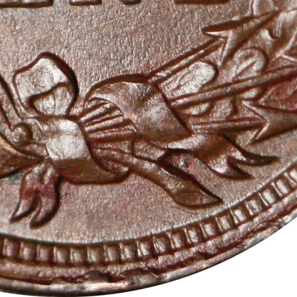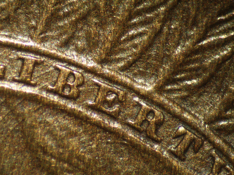 Macro Photography Of Obverse 20 Working Hub Artifact At 'S(T)ATES', Working Die Artifact Above '(O)F' and Clash Mark | ||