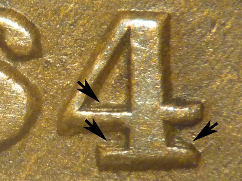 3. Die crack from the denticles at 8:15 into the left wreath.