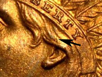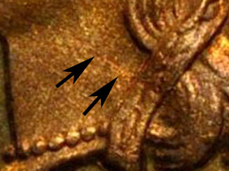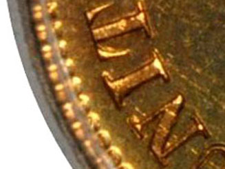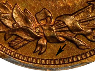 1865 Reverse A has now acquired a die file mark from the denticles at