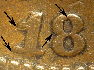 Obverse 9 is identified by repunching to the south on the 18, with date placement at B.