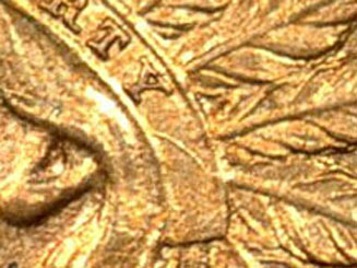 Obverse 1 is identified by a die scratch to the right of the Y of LIBERTY in the headband. Obverse 1 is observed with date placement at RE.