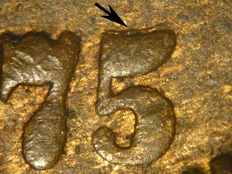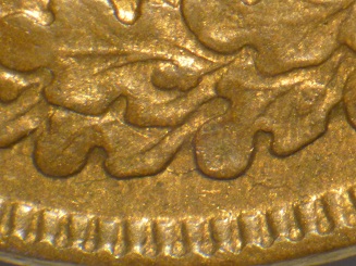 1. Light die crack from the rim at 8:30 throught the outer edge of the wreath to a point at 10:00.