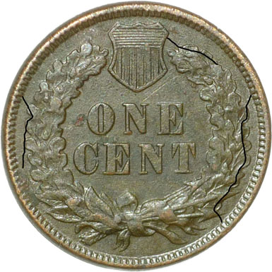 following die cracks: 1. Die crack from the right side of the shield down through the right wreath. 2. Die crack from the denticles at 2:15 down through the right wreath to the denticles at 4:30. 3. Die crack from the denticles at 9:45 down through the left wreath.