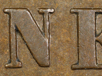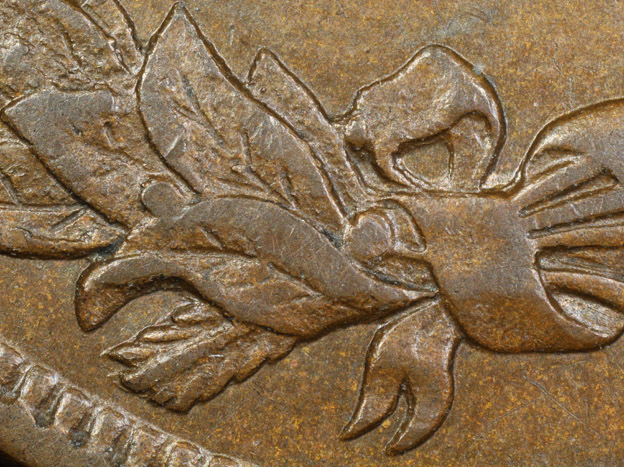 | Macro Photography Of Reverse AH Die Rust Within Ribbon Bow, Olive Leaves, Lower Oak Leaves and (C)ENT | ||