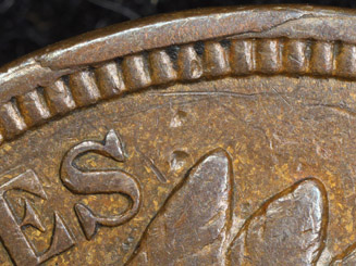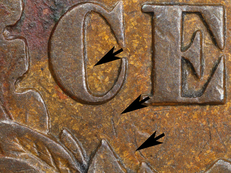 Reverse AL has acquired a clash mark through (C)ENT from a clashing event with Obverse 38.