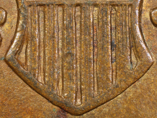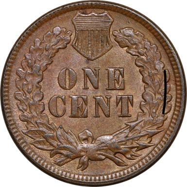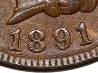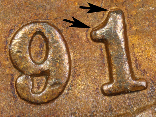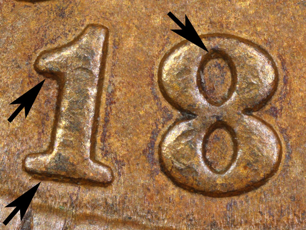 Reverse AM has developed the following die crack: 1. Light die crack segment located within the right wreath between 2:30 and 3:30.