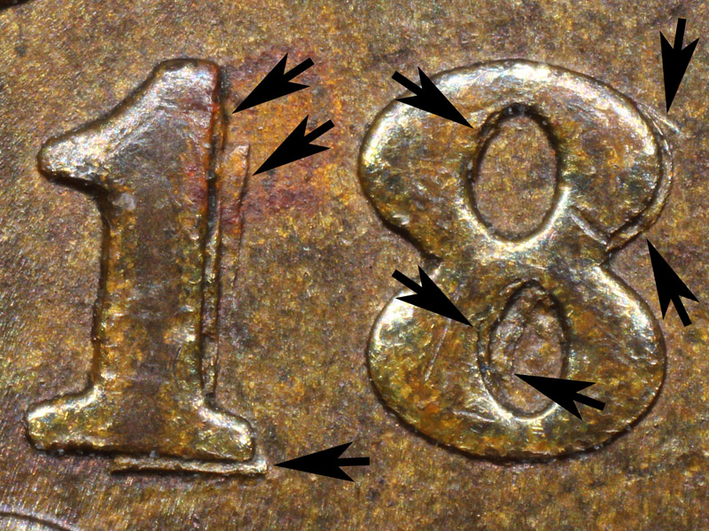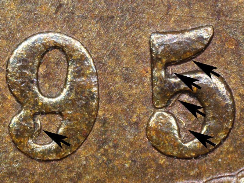 the 5. Obverse 13 has acquired a light clash mark in front of the eye of Miss Liberty.