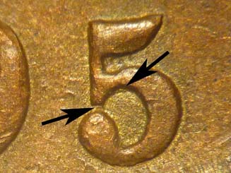 of the 5. Obverse 34 has developed heavy die flow lines.