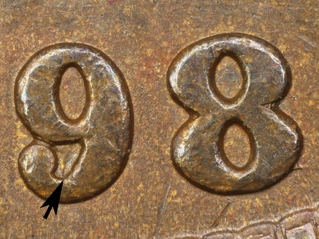 Reverse AAJ and has developed a die crack from the lower right side of the second 8 digit.