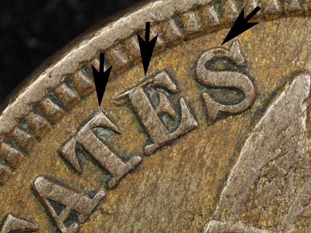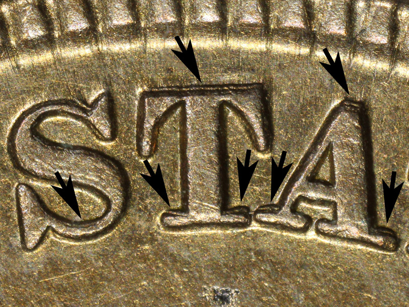 Obverse 4 features Class IV offset hub doubling on 'TATES OF AMER' and LIBERTY |