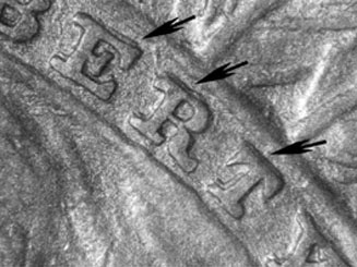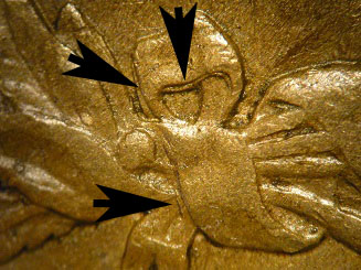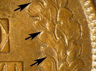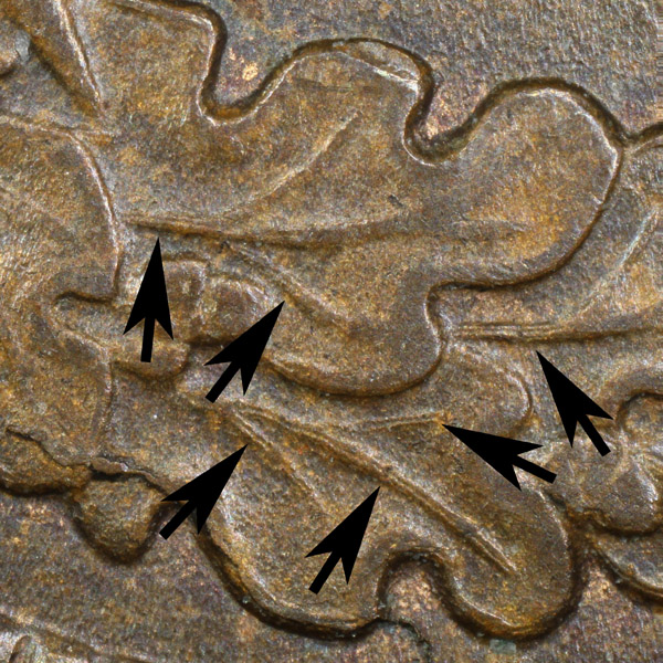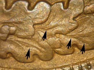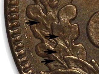 Reverse P features Class II hub doubling on the wreath veins and outside edges of the outer oak leaves in the left wreath between 8:00 and 10:30. |