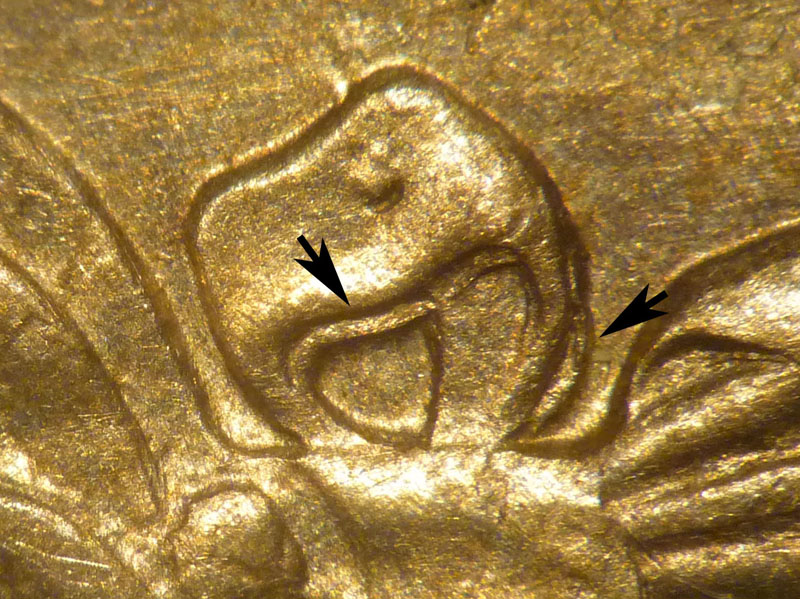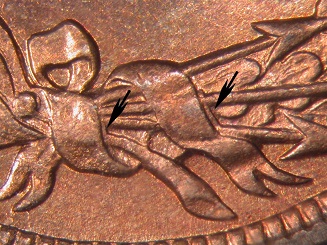 hub doubled die that shows doubling on the ribbon bow and arrow shafts.