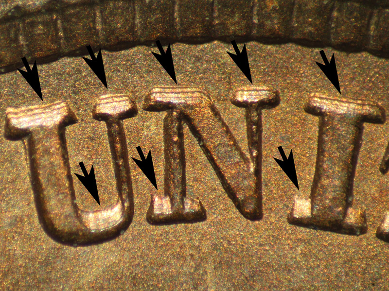 Obverse 7 features class II hub doubling on ED STATES OF AMER and Reverse G features class II hub doubling on the wreath veins within the right wreath. |