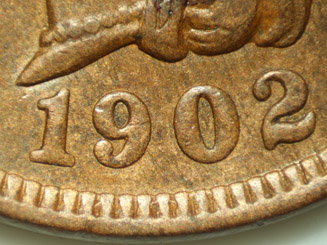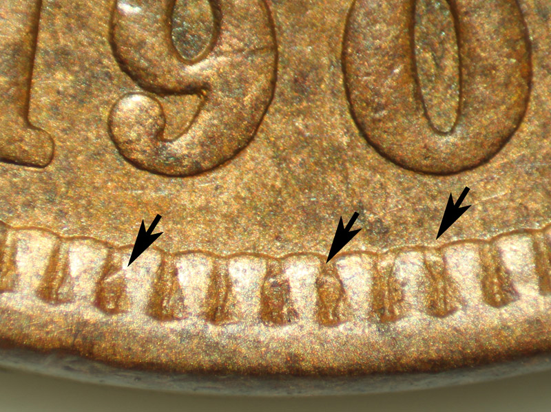 digits in the denticles below the 9 and 0 of the date. Obverse 5