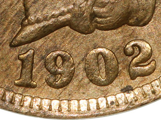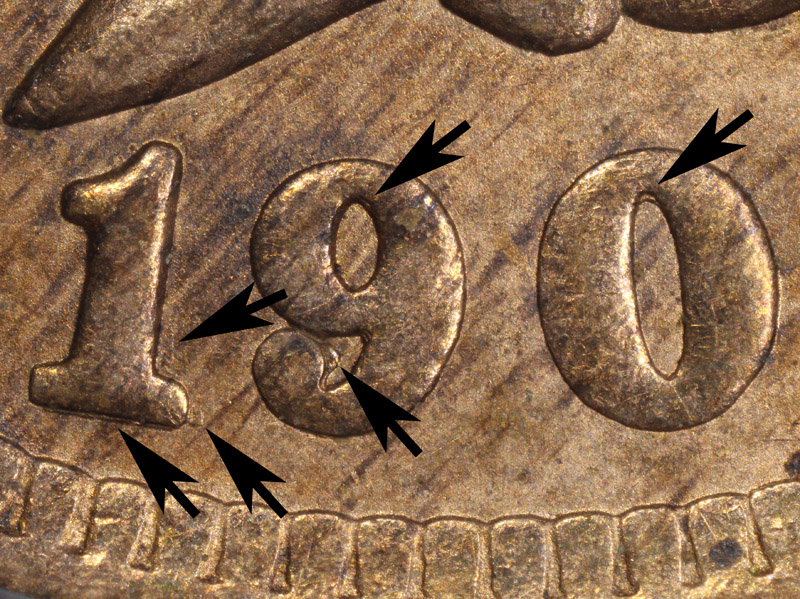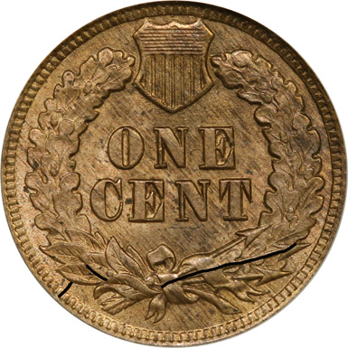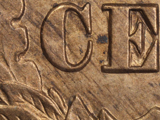 Reverse H has acquired a clash mark through (C)ENT and has developed the following die cracks: 1. Die crack from the rim at 7:30 extends upward into the middle outer olive leaf. 2. Die crack segment located along the outer edge of the olive leaf with the berry. 3.